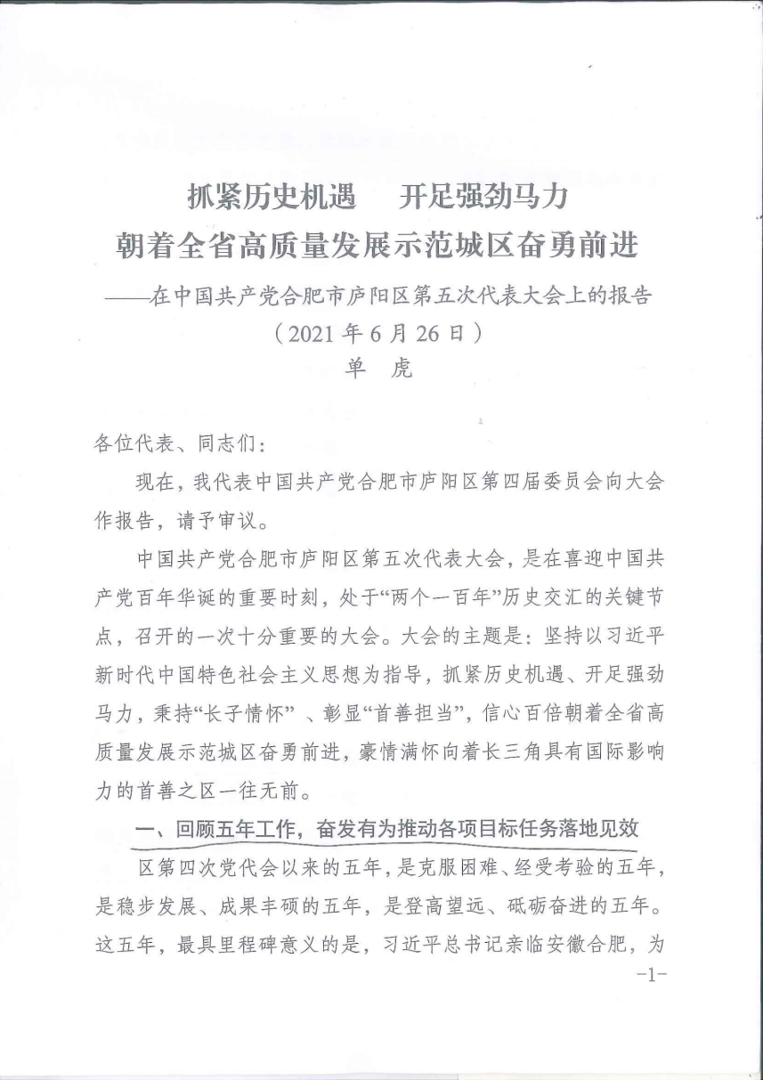 6月26日上午,中國共產(chǎn)黨合肥市廬陽區(qū)第五次代表大會(huì)在區(qū)政務(wù)中心開幕。單虎同志代表中國共產(chǎn)黨合肥市廬陽區(qū)第四屆委員會(huì)作報(bào)告。大會(huì)審查中國共產(chǎn)黨合肥市廬陽區(qū)第四屆紀(jì)律檢查委員會(huì)工作報(bào)告。